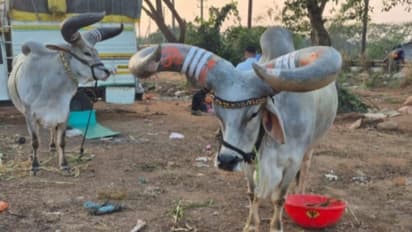 Maharashtra Devotees Tour Holy Sites With Giant Kankrej Bulls : महाराष्ट्रातील बीड जिल्ह्यातील आष्टी भागातील हिंदू मेडंगी जोशी समाजाचे भक्त आपल्या परंपरेनुसार, कांकरेज जातीच्या मोठ्या शिंगांच्या बैलांसह दरवर्षी पुण्यक्षेत्रांच्या दर्शनासाठी जातात. त्याचप्रमाणे, या वेळी ते आपल्या गावातून धर्मस्थळ, तिरुपती, पुरी जगन्नाथ क्षेत्राच्या दर्शनासाठी निघाले असून, यावेळी त्यांनी बी.सी. रोडवरील तलपाडी येथे विश्रांती घेतली.