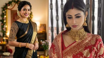 टेम्पल ज्वेलरीचा रिच आणि पारंपरिक लुक काळ्या-लाल साडीवर खूपच भारी दिसतो. ज्यांना साऊथ इंडियन स्टाइल आवडते, त्यांच्यासाठी हा एक बेस्ट ऑप्शन आहे. गोल्डन फिनिशिंग आणि देवी-देवतांच्या डिझाइनमुळे ही ज्वेलरी खास ठरते आणि तुमच्या लुकला एक वेगळाच रॉयल टच देते.