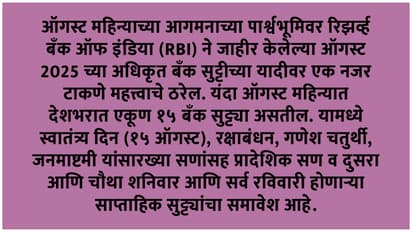 August 2025 Bank Holiday List : ऑगस्ट महिन्यात बॅंकांना रक्षाबंधन, स्वातंत्र्यदिनासह 15 दिवस सुट्या