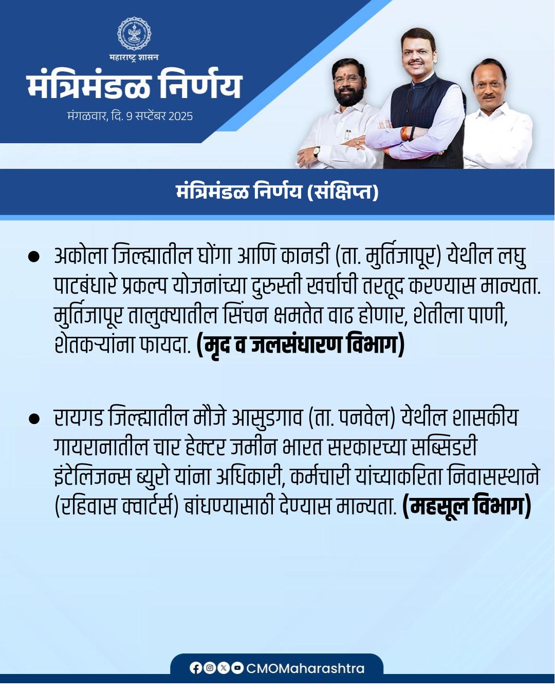 अकोला जिल्ह्यातील घोंगा आणि कानडी (ता. मुर्तिजापूर) येथील लघु पाटबंधारे प्रकल्प योजनांच्या दुरुस्ती खर्चाची तरतूद करण्यास मान्यता. मुर्तिजापूर तालुक्यातील सिंचन क्षमतेत वाढ होणार, शेतीला पाणी, शेतकऱ्यांना फायदा.