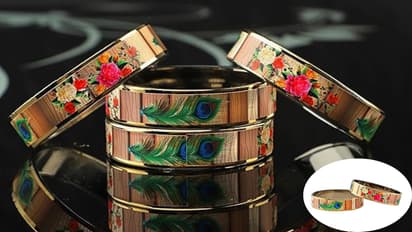 साध्या डिझाइनपेक्षा काहीतरी वेगळं हवं असेल, तर तुमच्या पत्नीला 4 पीस सेटमधलं हे ग्लास बँगल ब्रेसलेट नक्की आवडेल. यावर प्लेन किंवा ग्लिटर वर्कऐवजी प्रिंटेड 'मयूर थीम' (मोर डिझाइन) आहे. हे कडे रोजच्या वापरासाठी किंवा ऑफिसमध्ये घालण्यासाठी उत्तम आहेत. इतकंच नाही, तर तुम्ही याचा वापर 'कडा ब्रेसलेट' (Kada Bracelet) म्हणूनही करू शकता. 400 रुपये किमतीचा हा सेट सध्या Amazon वर 54% डिस्काउंटसह फक्त 231 रुपयांना मिळत आहे.