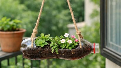 रिकामी कोकची बाटली मधोमध कापून घ्या. त्यात माती भरा आणि लहान रोप लावा. नंतर, दोरीच्या मदतीने ही बाटली बाल्कनी किंवा खिडकीत लटकवा. हा हँगिंग प्लांटर तुमच्या घराला एक फ्रेश आणि हिरवागार लूक देईल.