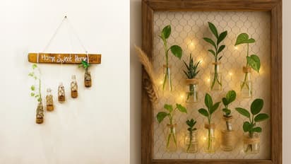 घरात जागा कमी असेल तर फ्रेम प्लांटर हा एक उत्तम पर्याय आहे. यासाठी कोणतीही लाकडी फ्रेम घेऊन त्यात जाळी लावा आणि सीरमच्या बाटल्या दोरीने बांधा. यात तुम्ही मनी प्लांट, स्नेक प्लांट किंवा लकी बँबू लावू शकता. कडेने लावलेले फेरी लाइट्स याला एक पूर्ण लूक देतील.