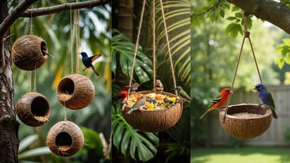 जुन्या नारळाची करवंटी चांगली स्वच्छ करा आणि तिला ड्रिलने भोक पाडून वरच्या बाजूला टांगण्याची सोय करा. या भोकांमधून सुतळी ओवून त्याला लटकवण्यासाठी हँगिंग स्ट्रक्चर तयार करा. त्यात पक्षांसाठी दाणे किंवा फळांचे तुकडे टाका. आता हे तुमच्या बाल्कनीत किंवा खिडकीबाहेर लटकवा.
