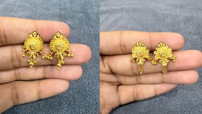 ७५० गोल्ड म्हणजेच १८ कॅरेटमधले स्टड इअररिंग्स नेहमीच फॅशनमध्ये असतात. हे एथनिक कपड्यांवर पारंपरिक आणि वेस्टर्न कपड्यांवर मॉडर्न लुक देतात. फोटोमध्ये दोन वेगवेगळे स्टड्स दाखवले आहेत, ज्यात मीनाकारी आणि सोन्याचं फिलिग्री वर्क आहे. हे फ्युजन फॅशनसाठी एकदम परफेक्ट आहेत. सोन्याचे लटकणारे मोती याला एक एलिगंट आणि सोफिस्टिकेटेड लुक देत आहेत. हे वजनाला हलके डिझाइन आहे, जे खास करून अशा महिलांसाठी बनवलं आहे ज्यांना सिंपल आणि क्लासी लुक आवडतो. कॅज्युअल गेट-टुगेदरपासून फॉर्मल कार्यक्रमांपर्यंत, हे कानातले तुम्हाला एक मॉडर्न चमक देतील.