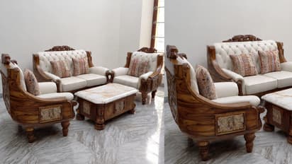 पारंपारिक नक्षीकाम आणि आधुनिक मार्बल फिनिश डिझाइन असलेला हा सोफा लिव्हिंग रूमला राजेशाही लुक देईल. फ्रेमवर बारीक हस्तकला आणि नक्षीदार लाकडी काम आहे, जे त्याचे सौंदर्य वाढवत आहे. सोबतच सेंटर टेबल प्रीमियम लुक देईल. ज्या घरांचा हॉल मोठा आहे, त्यांच्यासाठी हे सेट सर्वोत्तम आहेत. तुम्ही हे ऑनलाइन खरेदी करू शकता किंवा बनवूनही घेऊ शकता.