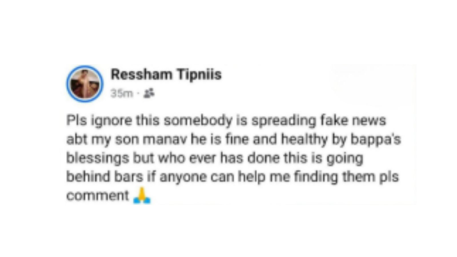 रेशमनं तात्काळ सोशल मीडियावर पोस्ट करून ही बातमी फेक असल्याचं स्पष्ट केलं. ती म्हणाली “कृपया खोटी बातमी पसरवणाऱ्यांकडे दुर्लक्ष करा. बाप्पाच्या कृपेनं माझा मुलगा मानव ठणठणीत आणि सुरक्षित आहे. पण ज्यांनी ही अफवा पसरवली, त्यांच्यावर कडक कारवाई होणार आहे.”