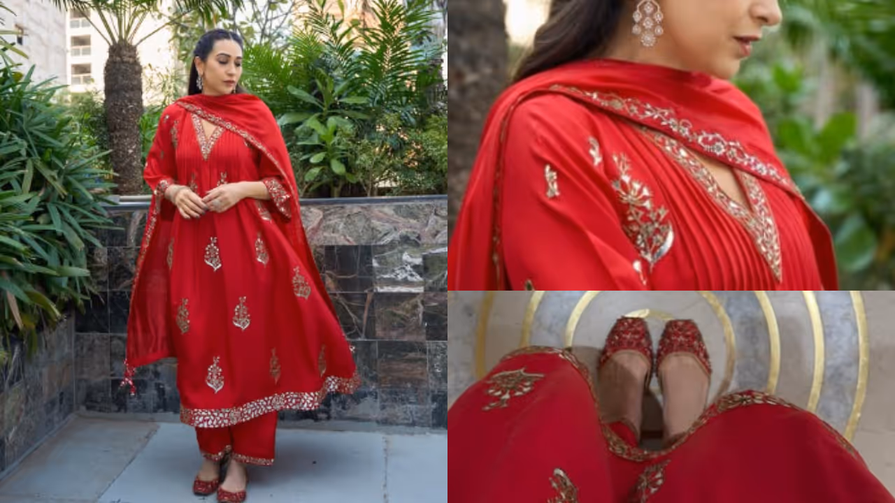 गडद लाल रंगाच्या या कुर्त्यावर चांदीच्या धाग्यांनी केलेले 'टिल्ला' एम्ब्रॉयडरी वर्क या ड्रेसला एक राजेशाही लुक देत आहे. साधी नेक डिझाइन आणि बाहींवरील छोटी एम्ब्रॉयडरी तिच्या सौंदर्यात भर घालत आहे. यासोबत तिने मॅचिंग स्ट्रेट पॅन्ट आणि पारदर्शक शीर दुपट्टा परिधान केला होता. ड्रेसला साजेसे 'फिझी गॉब्लेट' ब्रँडची सुंदर जुतीही करिश्माने घातली होती