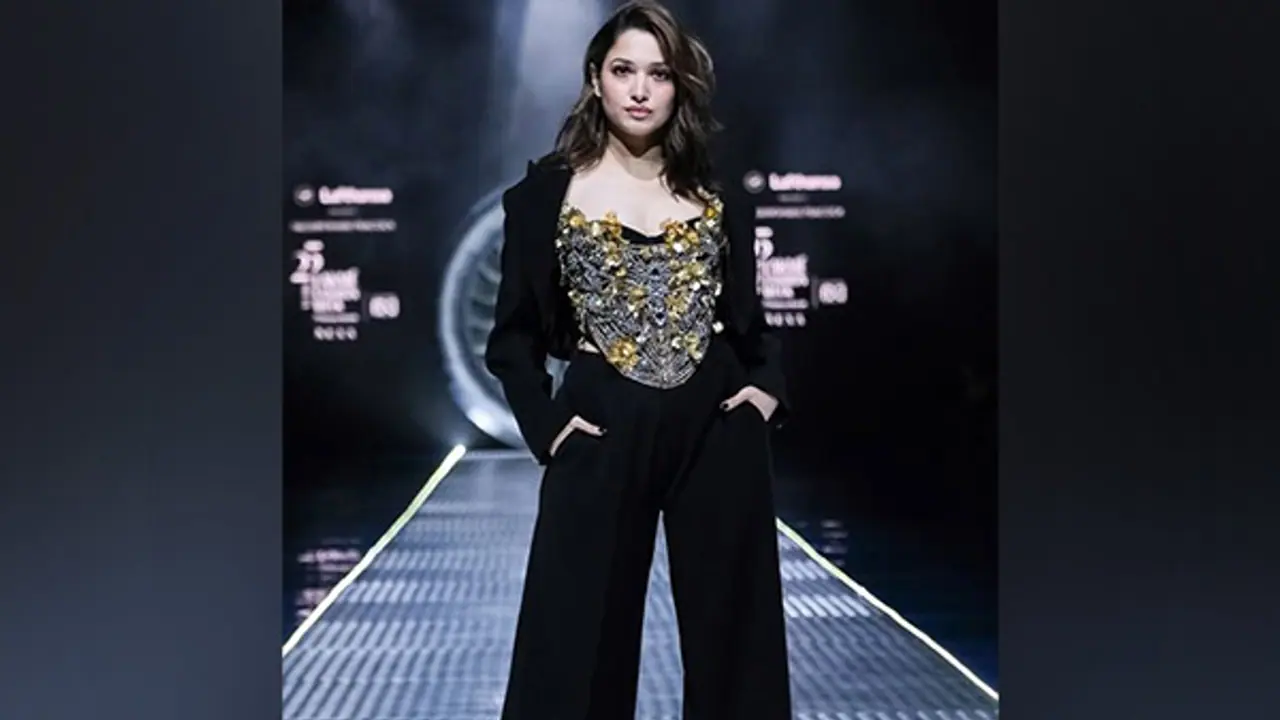 लॅक्मे फॅशन वीक २०२५ मध्ये अभिनेत्री तमन्ना भाटियाने फाल्गुनी शेन पीकॉकसाठी रॅम्प वॉक केला. तिने सोनेरी नक्षीकाम असलेला कोर्सेट टॉप परिधान केला होता, ज्यामुळे ती खूप सुंदर दिसत होती.