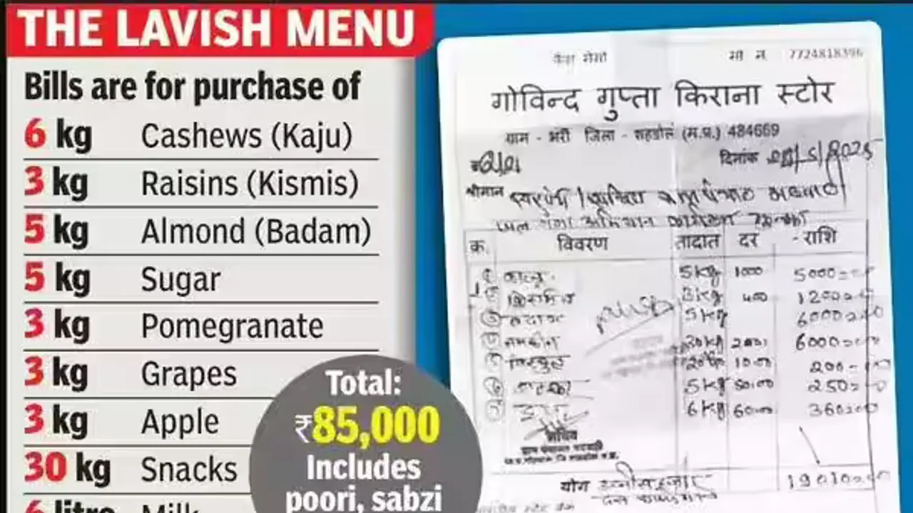 यासाठी तब्बल ८५,००० रुपये खर्च झाला आहे. जिल्हाधिकारी, वरिष्ठ अधिकारी, पंचायत प्रतिनिधी आणि काही ग्रामस्थ असे एकूण २४ जण सभेत उपस्थित होते. यावेळी आणलेल्या खाद्यपदार्थांचे बिल व्हायरल झाले आहे. त्यानुसार, ६ किलो काजू, ३ किलो मनुके, ३ किलो बदाम, ९ किलो फळे, ५ डझन केळी आणि ३० किलो स्नॅक्स खरेदी करण्यात आले.