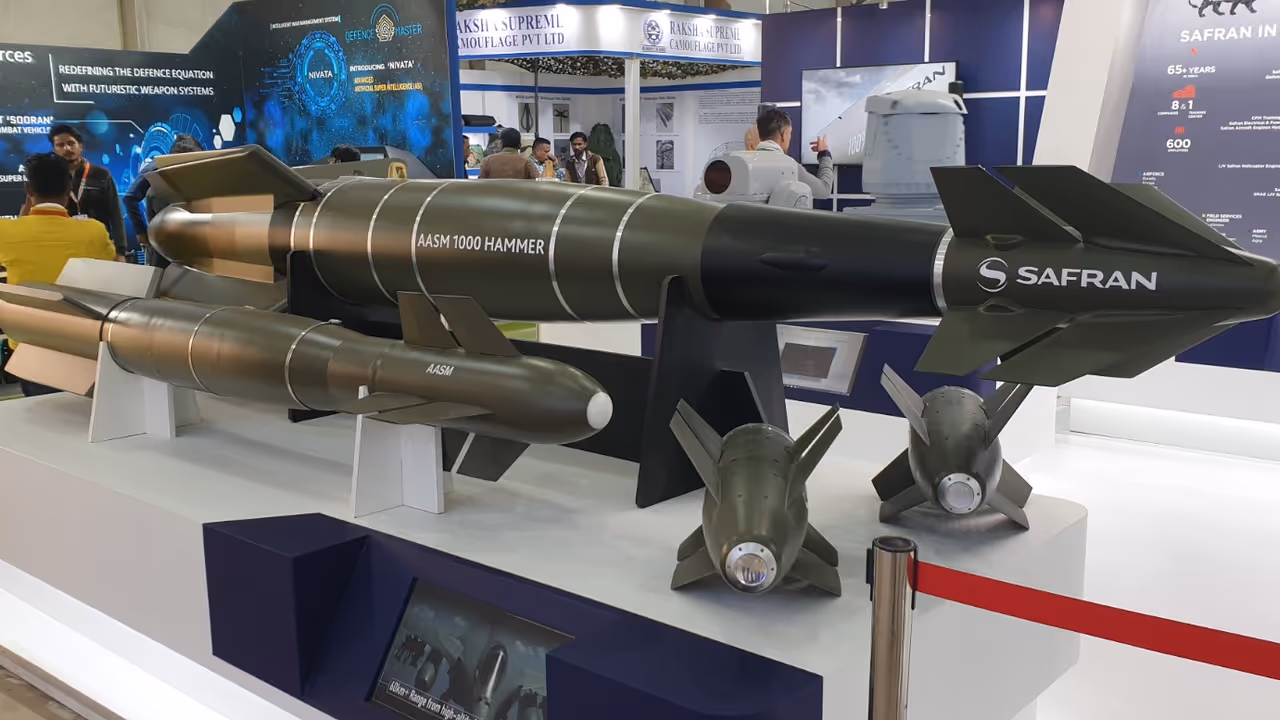 Safran ने विकसित केलेले, हॅमर – अधिकृतपणे AASM (Armement Air-Sol Modulaire) म्हणून ओळखले जाते – हे उच्च अचूकता आणि विस्तारित पल्ल्यासाठी डिझाइन केलेले एक मॉड्युलर प्रिसिजन-गायडेड शस्त्र आहे.