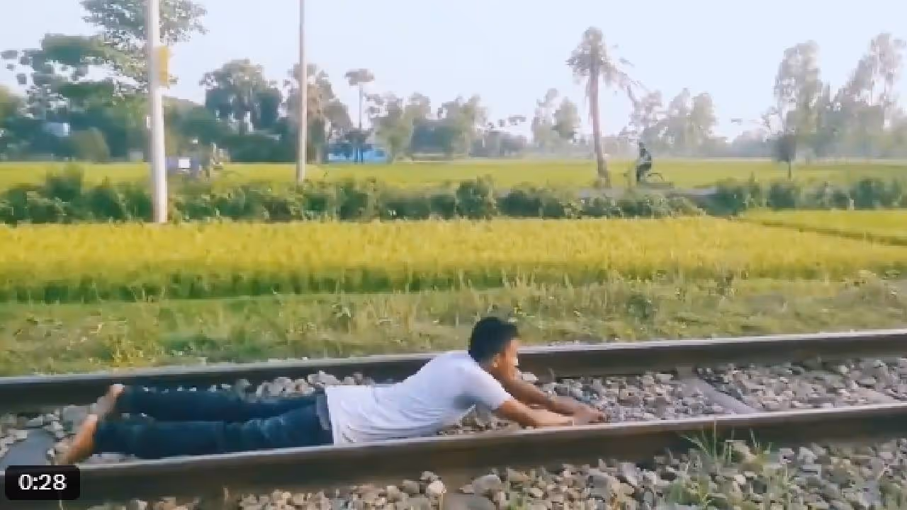 व्हिडिओमध्ये एक तरुण रेल्वे ट्रॅकवर झोपलेला दिसत आहे. त्याचवेळी एक ट्रेन येत आहे. ट्रेन येईपर्यंत तो तरुण ट्रॅकवरच झोपलेला राहतो. ट्रेन गेल्यानंतर तो तरुण कोणतीही दुखापत न होता उठून येतो. व्हिडिओ बनवणारी व्यक्ती त्या तरुणाला कसे झोपायचे याचे निर्देशही देत आहे.
