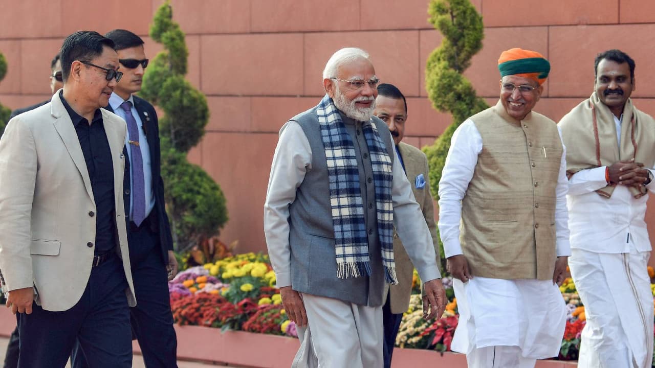 पंतप्रधान नरेंद्र मोदी, केंद्रीय मंत्री अर्जुन राम मेघवाल, किरेन रिजिजू, राज्यमंत्री जितेंद्र सिंह आणि राज्यमंत्री एल. मुरुगन सोमवारी संसदेच्या हिवाळी अधिवेशनापूर्वी एकत्र दिसले.