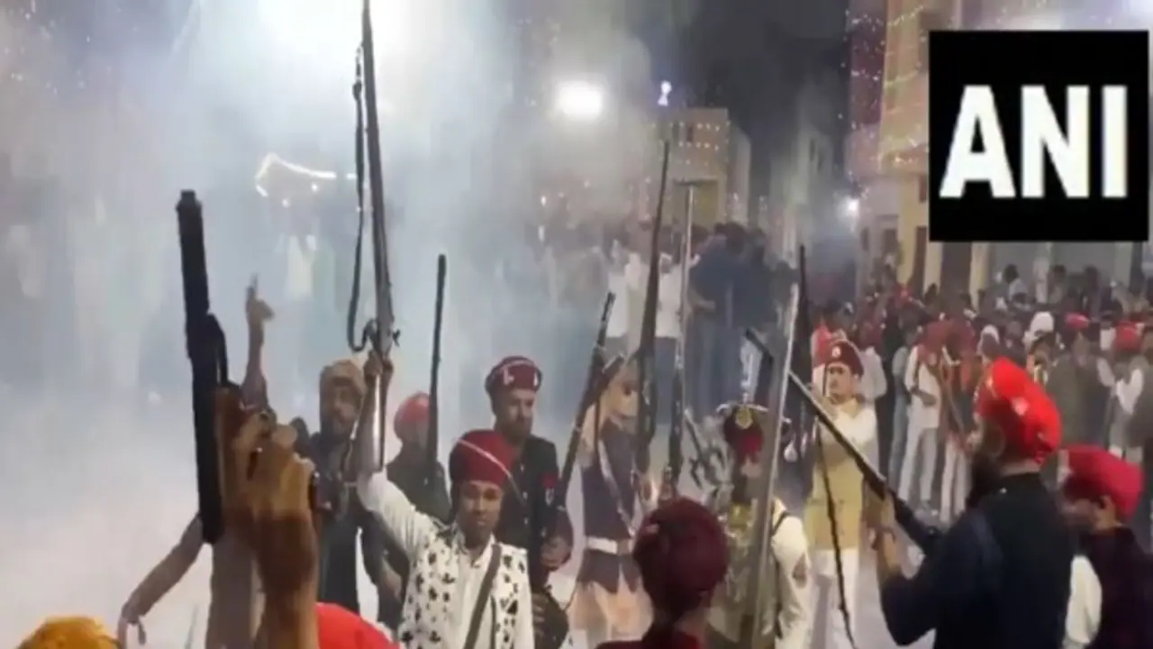 उदयपूर (राजस्थान) [भारत], (एएनआय): राजस्थानच्या उदयपूर जिल्ह्यातील मेनार या गावाने 'दारूगोळा होळी' चा अनोखा उत्सव साजरा केला. स्थानिक लोकांनी शनिवारी फटाके, तोफा आणि बंदुकांच्या प्रदर्शनाने हा सण साजरा केला.