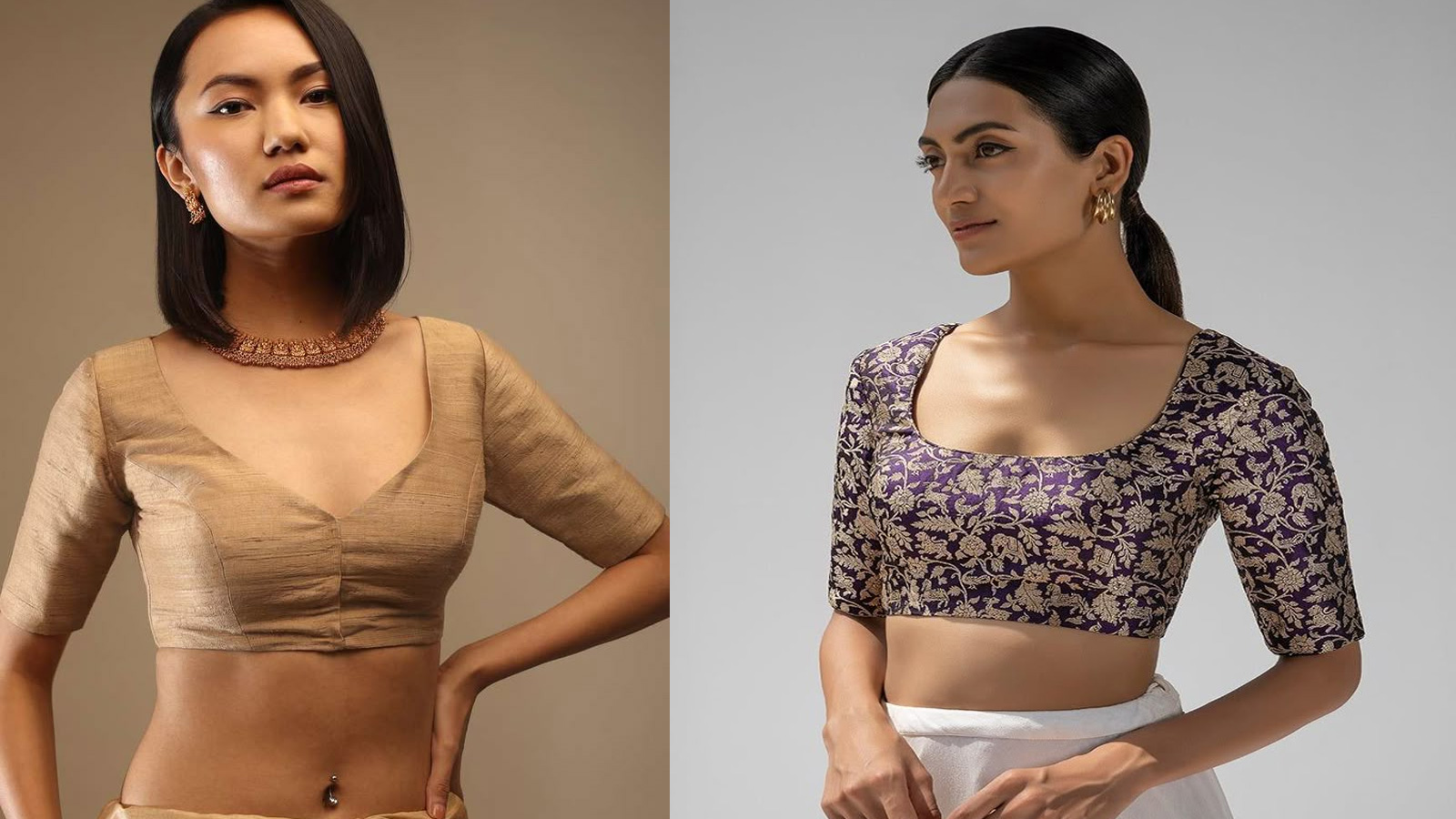 येथे यू-शेप ब्लाउजचे दोन डिझाईन्स दाखवले आहेत. पहिल्यामध्ये यू-शेपसोबत थोडासा व्ही टच दिला आहे. फ्रंट हुकसह हा ब्लाउज डिझाईन पूर्णपणे पारंपारिक लूक तयार करत आहे. दुसऱ्या ब्लाउजमध्ये यू नेकलाइनला खूप वाईल्ड ठेवले आहे. हुक मागे दिला आहे. ज्यामुळे फ्रंटचा उभार एका आकारात दिसत आहे. प्रत्येक प्रकारच्या साडीसोबत हा ब्लाउज डिझाईन परिपूर्ण दिसेल.