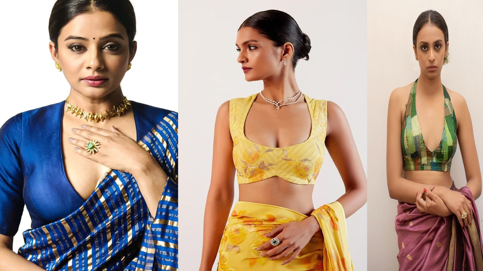 या चित्रात ३ प्रकारचे यू-शेप ब्लाउज डिझाईन दाखवले आहेत. जे तुम्ही तुमच्या आवडीनुसार शिंपीकडून शिवू शकता. डीप यू-शेप ब्लाउज डिझाईनमध्ये छाती आणि खांद्याचा भाग पूर्णपणे झाकून क्लीवेजपर्यंत कट दिला जातो. जो पदर सोबत थोडासा संस्कारी लूक देतो आणि थोडासा बोल्ड.