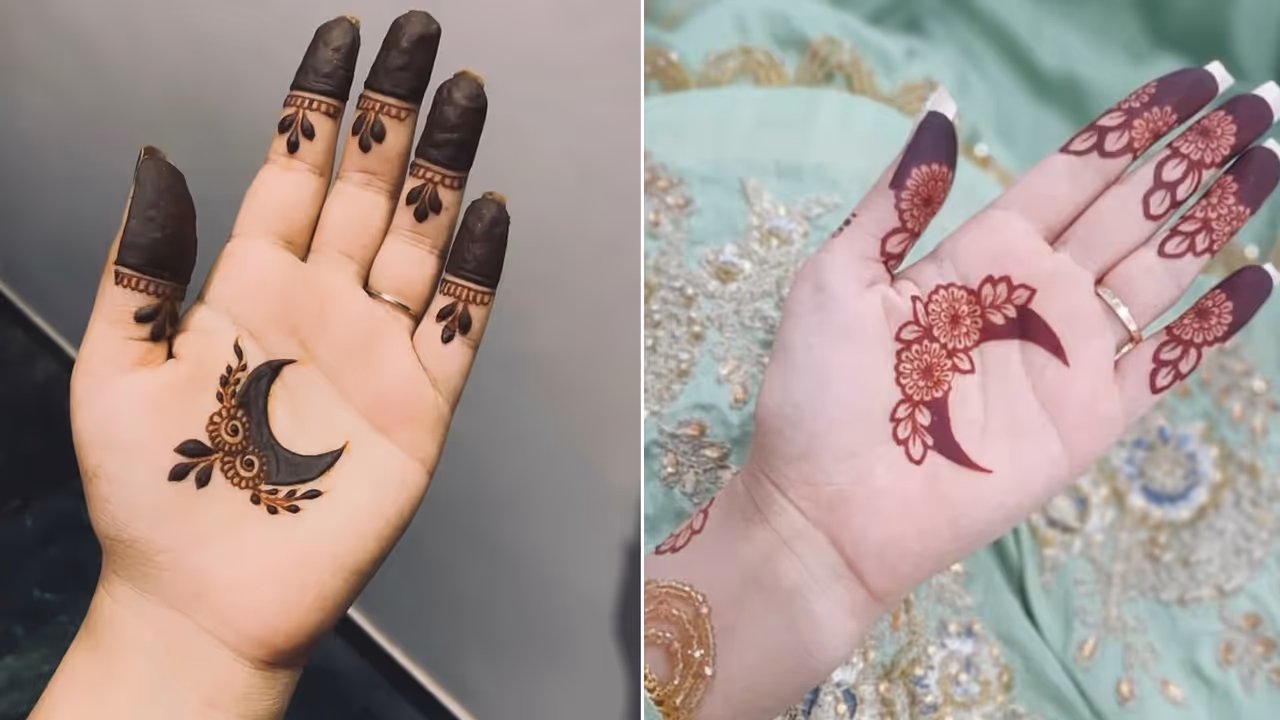 तळहातावर अशा प्रकारच्या अर्ध्या चंद्राची मेहंदी डिझाईन खूपच सुंदर दिसेल. तुम्ही तुमच्या तळहाताच्या मध्यभागी दोन मोठे चंद्र विरुद्ध दिशेने काढा. त्याच्या खाली फुलांची डिझाईन द्या. बोटांच्या पेरांवरही फुलांची डिझाईन काढून मेहंदीचा लूक पूर्ण करा.