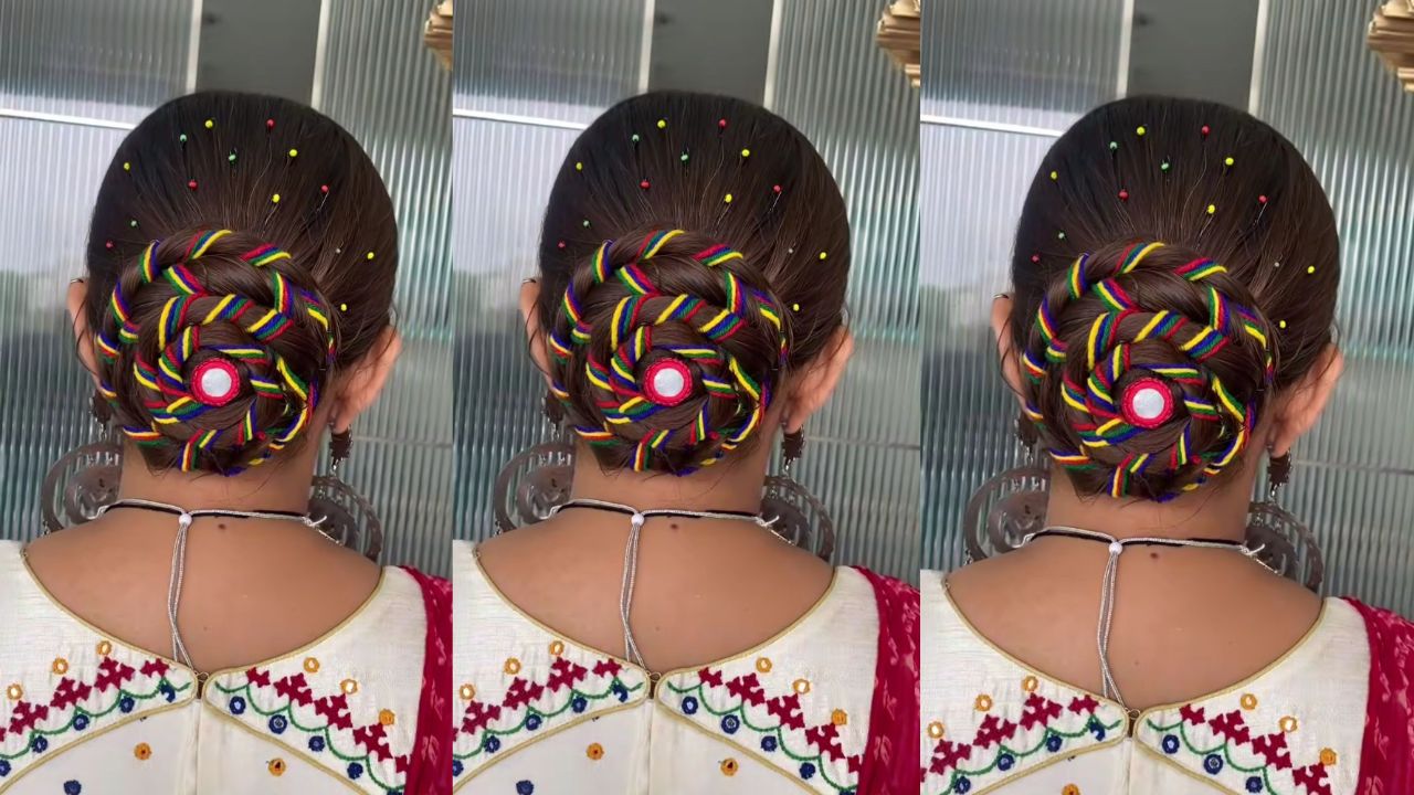 गरब्यामध्ये साधा बन नाही, तर काहीतरी युनिक आणि फंकी असेल तर खूप छान वाटतं. अशाप्रकारे चनिया चोळीसोबत सेलिब्रिटी लूक हवा असेल किंवा तासनतास गरबा खेळण्याचा प्लॅन असेल, तर हा हेअर लूक परफेक्ट आहे. यामध्ये मल्टी कलर धाग्याला वेणी किंवा केसांसोबत गुंफून पिनांच्या साहाय्याने बन बनवून सेट केले आहे. तुम्ही याला अधिक युनिक लूक देण्यासाठी मध्ये आरसे, कवड्या किंवा पोम-पोम लावू शकता.