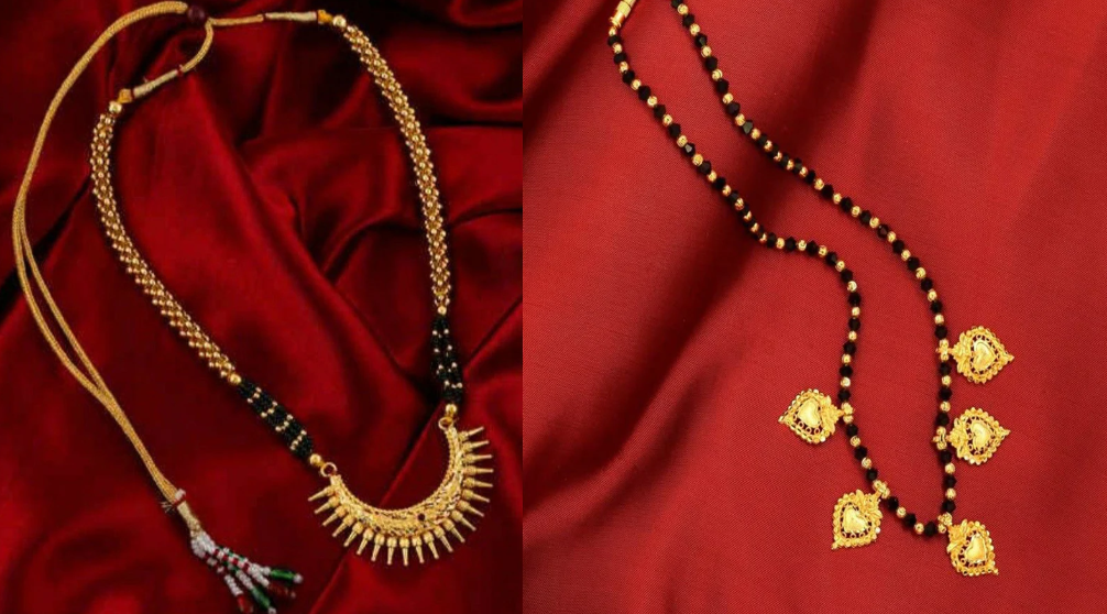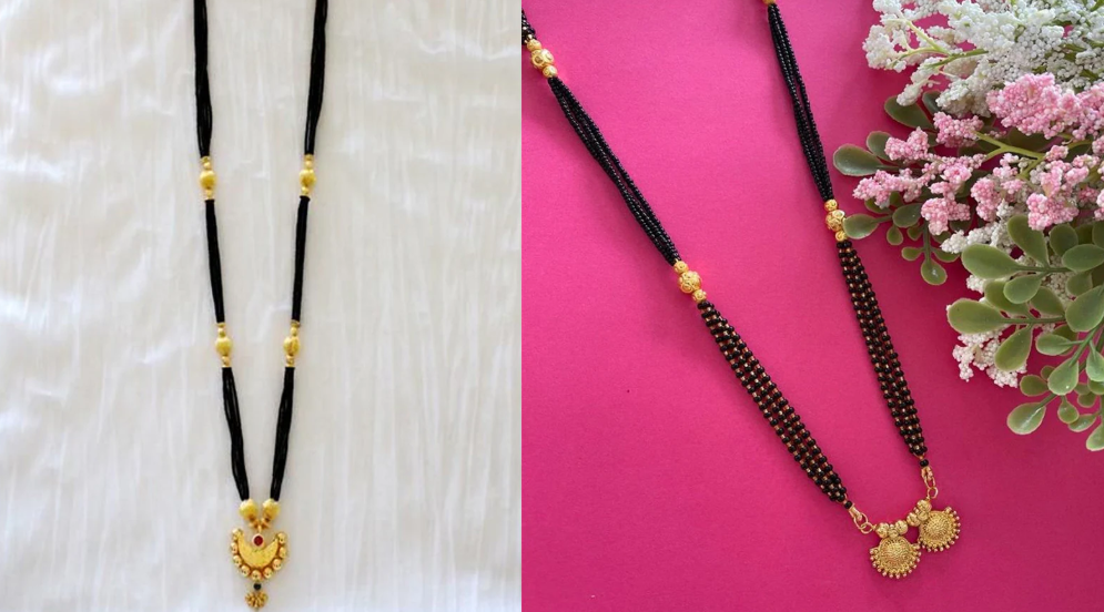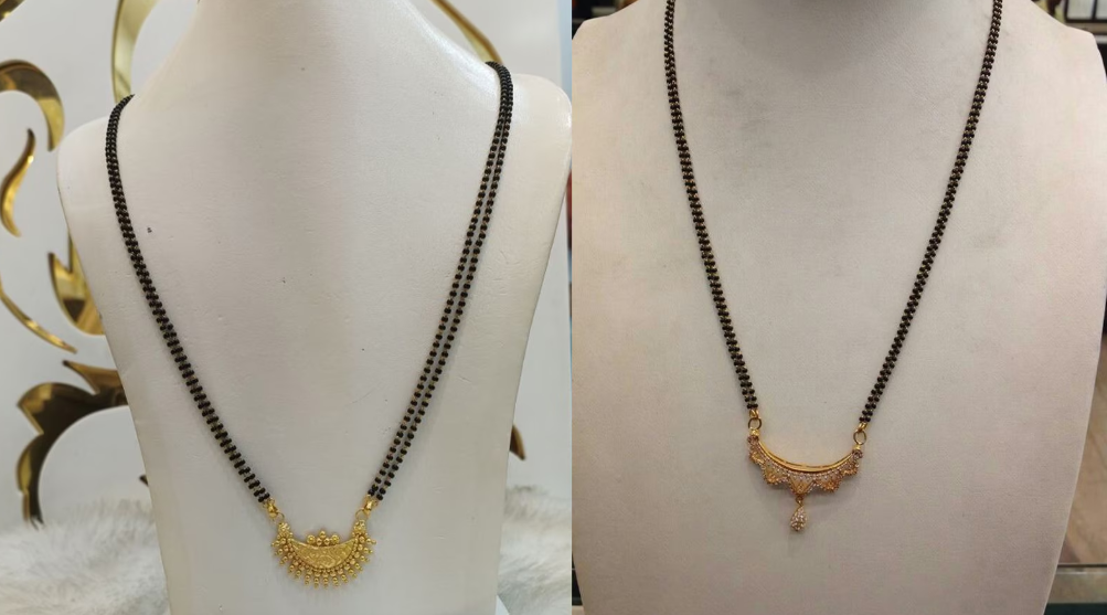 गोल्ड आणि काळ्या मण्यांनी सजवलेले हे मंगळसूत्र खास त्याच्या पेंडंटमुळे वेगळे ठरते. एका डिझाईनमध्ये चंद्राकार पेंडंट असून त्याखाली सुंदर कलाकुसर आहे. दुसऱ्या डिझाईनमध्ये पाच छोटे-छोटे पेंडंट्स आहेत, जे एकाच साखळीत व्यवस्थित लावलेले असतात. एक डिझाईन आधुनिक वाटते, तर दुसरे पूर्ण पारंपरिक. तुम्ही तुमच्या बजेट आणि आवडीनुसार हे डिझाईन निवडू शकता.