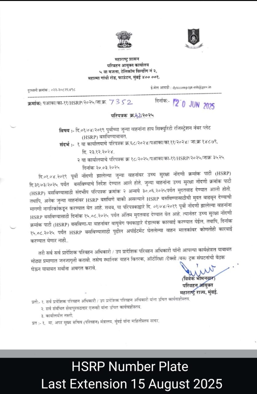 मुंबई : महाराष्ट्र शासनाने जुन्या वाहनांवर हाय-सिक्युरिटी रजिस्ट्रेशन प्लेट (HSRP) बसवण्याची अंतिम मुदत आणखी एकदा वाढवली आहे. आता १ एप्रिल २०१९ पूर्वी नोंदणीकृत सर्व वाहनांसाठी ही प्लेट बसवण्याची अंतिम तारीख १५ ऑगस्ट २०२५ निश्चित करण्यात आली आहे. राज्य सरकारकडून यावेळी स्पष्ट करण्यात आले आहे की, ही मुदत अंतिम आहे आणि त्यानंतर HSRP नसलेल्या वाहनांवर दंडात्मक कारवाई केली जाईल.