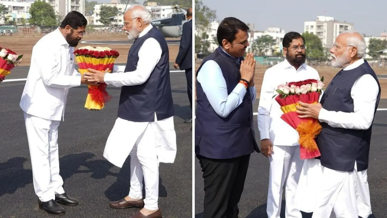 पंतप्रधान नरेंद्र मोदी (PM Narendra Modi) 27व्या राष्ट्रीय युवा महोत्सव आणि मुंबईतील अटल सेतूचे उद्घाटन करण्यासाठी शुक्रवारी (12 जानेवारी 2024) महाराष्ट्राच्या दौऱ्यावर होते. पंतप्रधान मोदी राज्यात दाखल झाल्यानंतर मुख्यमंत्री एकनाथ शिंदे यांनी पुष्पगुच्छ देऊन त्यांचे स्वागत केले. उपमुख्यमंत्री देवेंद्र फडणवीस आणि उपमुख्यमंत्री अजित पवार तसेच प्रशासकीय अधिकारी देखील यावेळेस उपस्थित उपस्थित होते.