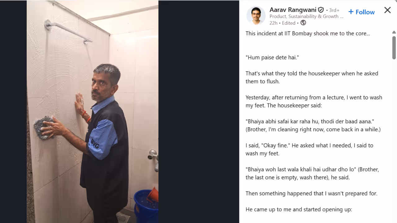 मुंबई: आईआईटी मुंबईतील विद्यार्थी आरव रंगवानी यांची लिंक्डइनवरील एक पोस्ट व्हायरल झाली आहे. या पोस्टमध्ये त्यांनी कॅम्पसमधील एका धक्कादायक घटनेचा उल्लेख केला आहे. विद्यार्थ्यांना साफसफाई राखण्यास सांगितल्यानंतरही त्यांच्याकडून होणाऱ्या दुर्लक्षाबद्दल एका हाऊसकीपरने व्यक्त केलेली असहायता त्यांनी आपल्या पोस्टमध्ये मांडली आहे. जेव्हा त्यांना शौचालये स्वच्छ ठेवण्याची किंवा कचरा योग्यरित्या टाकण्याची आठवण करून दिली जाते, तेव्हा काही विद्यार्थी उद्धटपणे “हम पैसे देते है” असे उत्तर देतात. ही वृत्ती त्यांना हादरवून टाकणारी असल्याचे रंगवानी यांनी लिहिले आहे.