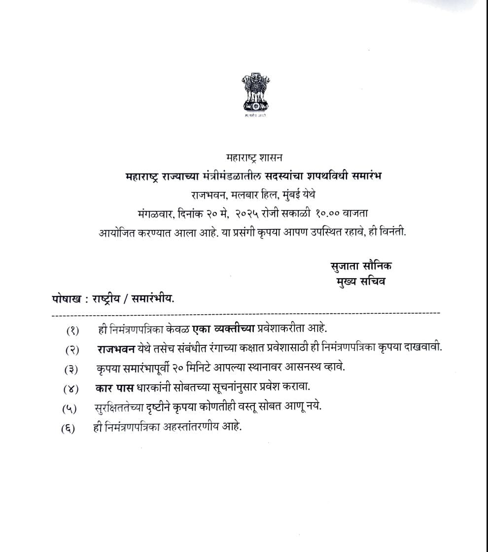 मुंबई - महाराष्ट्राच्या राजकारणात मोठी घडामोड. राष्ट्रवादी काँग्रेसचे ज्येष्ठ नेते व राज्याचे माजी उपमुख्यमंत्री छगन भुजबळ आज मंगळवारी सकाळी १० वाजता राजभवन, मुंबई येथे मंत्रिपदाची शपथ घेणार आहेत. राज्याच्या मुख्य सचिव सुजाता सौनिक यांनी मंत्रिमंडळ विस्ताराबाबत अधिकृत परिपत्रक जारी केले असून, शपथविधी कार्यक्रमासाठी मोजक्याच पाहुण्यांना निमंत्रण देण्यात आले आहे.