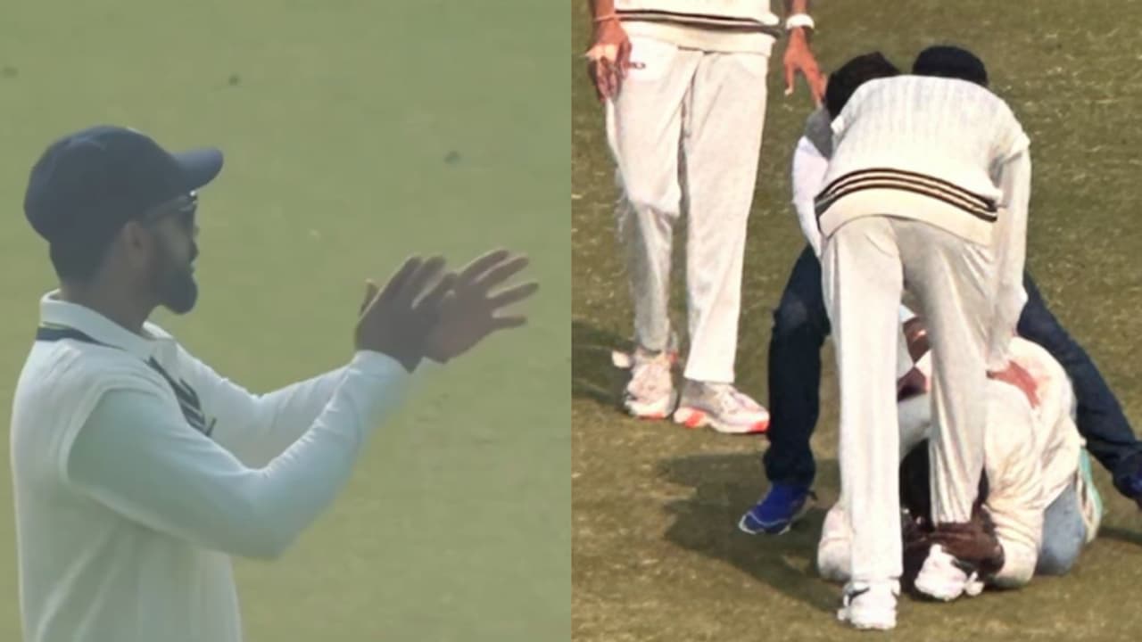 दिल्ली: १३ वर्षांनंतर रणजी करंडक क्रिकेटमध्ये विराट कोहलीच्या परतण्याचे चाहते उत्साहाने स्वागत करत होते. दिल्ली-रेल्वे सामन्यात विराट कोहलीला खेळताना पाहण्यासाठी हजारो चाहते दिल्लीतील अरुण जेटली स्टेडियमवर गर्दी केली होती. विराट कोहली खेळत असल्याने सामन्यासाठी अतिरिक्त सुरक्षा व्यवस्था होती, तरीही रेल्वेच्या डावात एक चाहता मैदानात धावत आला आणि स्लिपमध्ये फिल्डिंग करत असलेल्या विराट कोहलीच्या पाया पडला.