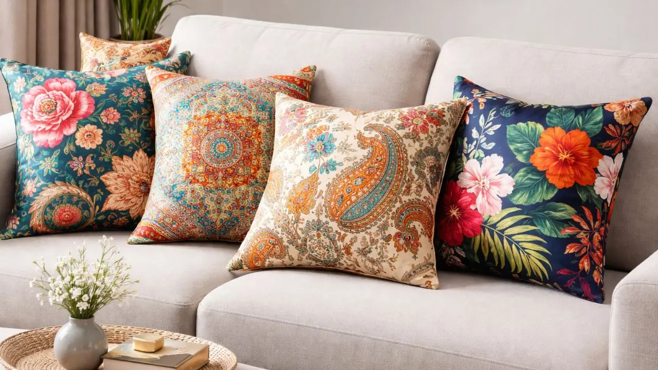 प्रिंटेड सिल्क कुशन कव्हर: फ्लोरल, जॉमेट्रिक किंवा एथनिक प्रिंट असलेले सिल्क कुशन कव्हर सध्या खूप ट्रेंडमध्ये आहेत. हे डिझाइन मॉडर्न आणि फंकी लुक देतात, ज्यामुळे तुमची लिव्हिंग रूम फ्रेश आणि स्टायलिश दिसते. फिकट आणि गडद रंगांचं कॉम्बिनेशनही खूप आकर्षक दिसतं.