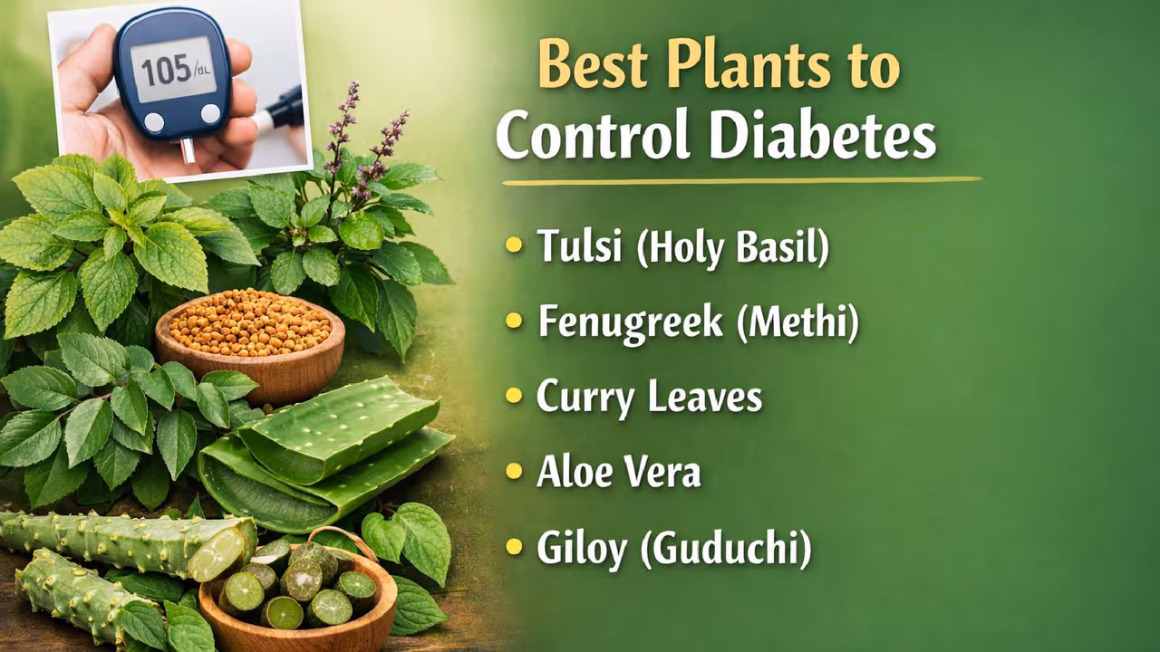 Diabetes Control Plants: डायबिटीज नियंत्रणात ठेवण्यासाठी काही औषधी वनस्पती खूप फायदेशीर ठरू शकतात. तुळस, मेथी, कढीपत्ता, कोरफड आणि गुळवेल यांसारखी झाडं घरात सहज लावता येतात. नैसर्गिकरित्या रक्तातील साखर नियंत्रणात ठेवण्यासाठी यांची मदत होते.