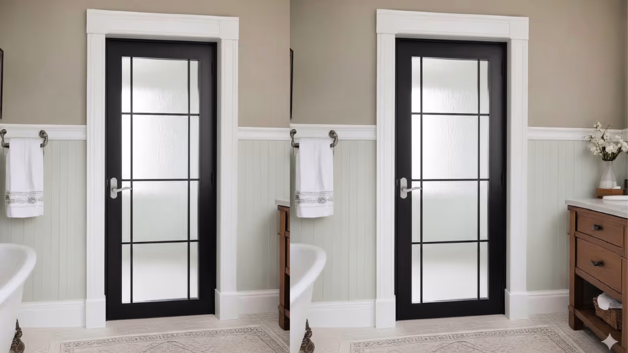 लाइट ओक फिनिश वुड टेक्सचर असलेल्या दरवाजाला हाफ सर्कल ग्लास पॅनल आहे. या काचेवर रंगीबेरंगी पानांचे सुंदर नक्षीकाम आहे, जे मुख्य दरवाजा आणि बेडरूमला कलात्मक आणि मॉडर्न लुक देते. दुसरा दरवाजा चेरी रेड लाकडी रंगाचा आहे, ज्यात मोठ्या भागावर नक्षीदार फ्लोरल ग्लास वापरला आहे. तुम्हाला पारंपरिक लुक हवा असेल तर हा उत्तम पर्याय आहे.