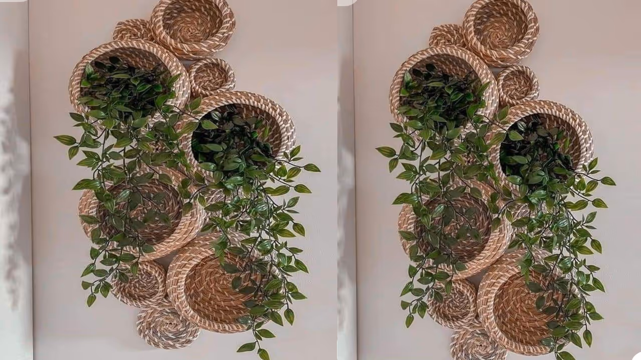 ही वॉल डेकोर डिझाइन खूप युनिक आणि नॅचरल फील देणारी आहे. यात वेगवेगळ्या आकाराच्या टोपल्या भिंतीवर कलात्मक पद्धतीने लावल्या आहेत. या टोपल्यांमध्ये छोटी-छोटी रोपं ठेवून हिरवाईचा सुंदर टच दिला आहे, ज्यामुळे संपूर्ण रूम फ्रेश आणि क्लासी दिसते. सोबतच लाकडी डेकोर पीस आणि खाली ठेवलेली इनडोअर रोपं या सेटअपला अधिक आकर्षक बनवतात. ज्यांना घरात बजेट-फ्रेंडली आणि इको-फ्रेंडली डेकोरेशन करायचं आहे, त्यांच्यासाठी ही डिझाइन परफेक्ट आहे.