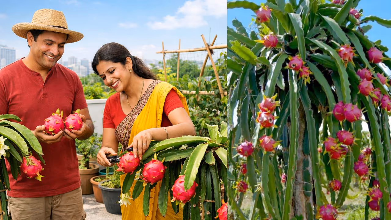 घराच्या गच्चीवर किंवा बाल्कनीत ड्रॅगन फ्रूट लावणं खूप सोपं आणि फायद्याचं आहे. योग्य कुंडी, माती आणि थोडीशी काळजी घेतली की कमी मेहनतीत भरपूर फळं मिळतात.