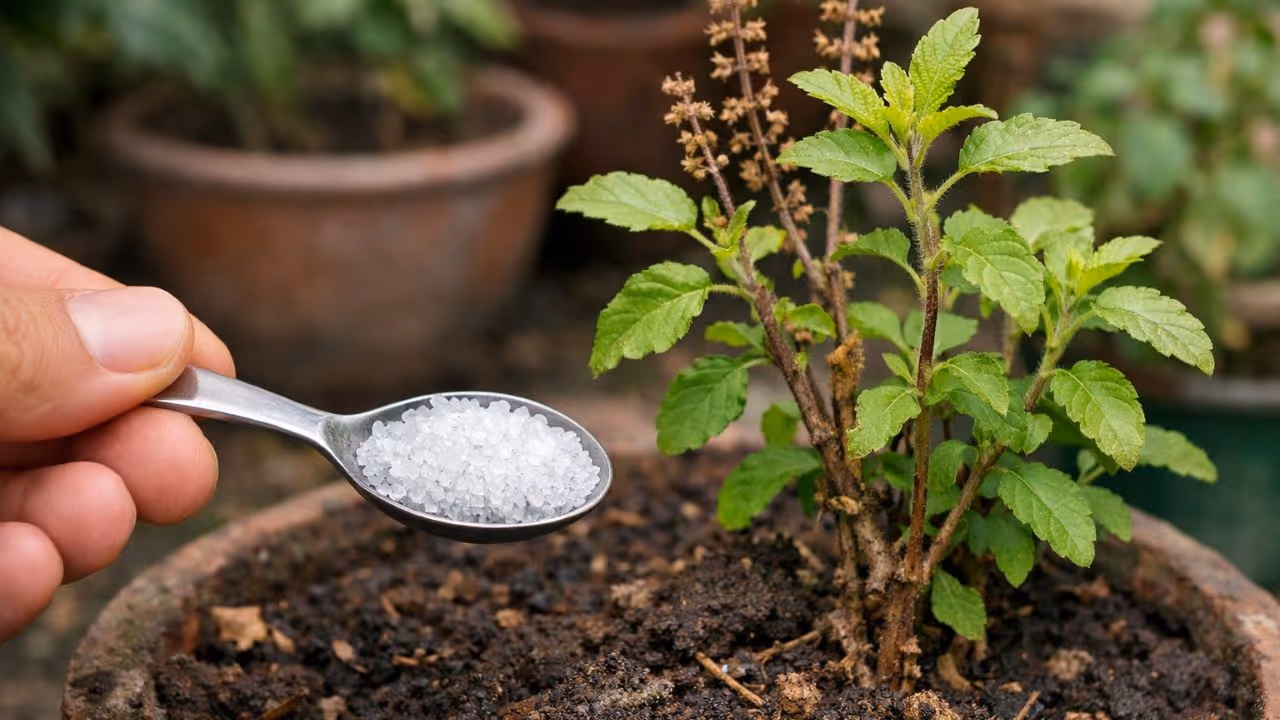 आपल्या घरात तुळशीचं रोप फक्त श्रद्धेचं प्रतीक नाही, तर एक नैसर्गिक औषधही आहे. पण अनेकदा योग्य काळजी न घेतल्याने, जास्त पाणी घातल्याने, खराब माती किंवा पोषक तत्वांच्या कमतरतेमुळे तुळस सुकायला लागते. विशेषतः हिवाळ्यात ही समस्या जास्त वाढते. अशावेळी लोक वेगवेगळे घरगुती उपाय करून पाहतात. त्यापैकीच एक उपाय म्हणजे "मीठ घालणे". पण लक्षात ठेवा, आपलं साधं खाण्याचं मीठ (टेबल सॉल्ट) रोपासाठी हानिकारक ठरू शकतं, किंबहुना ते रोपाला आणखी सुकवू शकतं. योग्य मीठ आणि योग्य प्रमाणात वापरल्यासच तुळस पुन्हा हिरवीगार होऊ शकते.