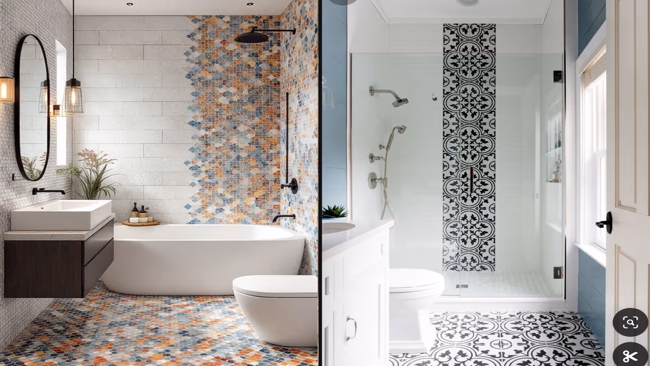 तुम्हाला बाथरूममध्ये थोडा आर्टिस्टिक टच हवा असेल, तर तुम्ही फ्लोअर आणि भिंती दोन्हींवर मोझॅक टाइल्स लावू शकता. बाजारात रंगीबेरंगी किंवा एकाच रंगाच्या मोझॅक टाइल्समध्ये भरपूर व्हरायटी उपलब्ध आहे. इथं दाखवलेल्या दोन डिझाइन्स वापरून तुम्ही तुमचा बाथरूम अधिक सुंदर बनवू शकता.