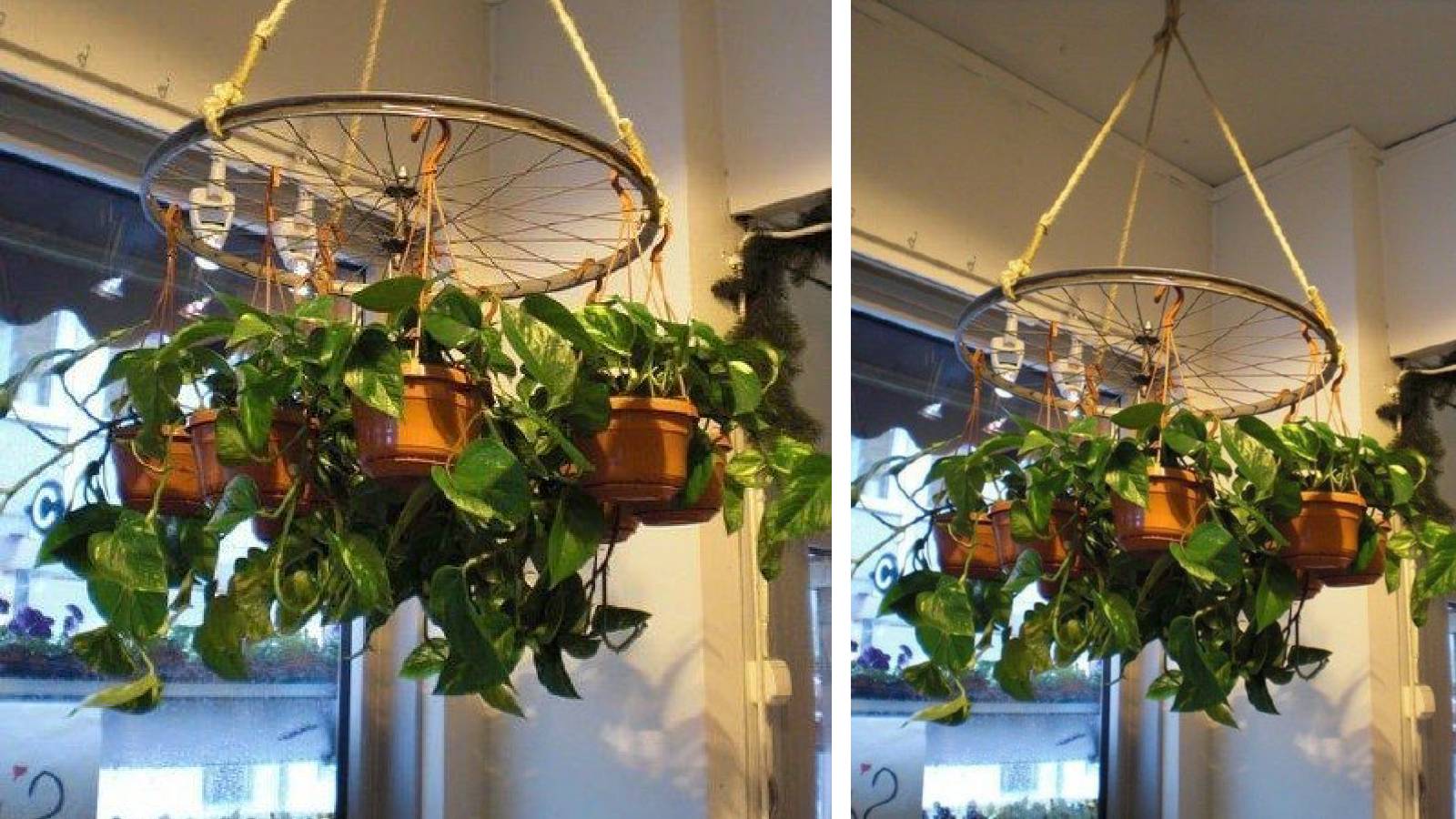 हँगिंग प्लांटसाठी तुम्ही सायकलच्या रिंगचा वापर करू शकता. यासाठी ज्यूटची दोरी किंवा लोखंडी साखळीच्या मदतीने सायकलची रिंग छताला किंवा बाल्कनीमध्ये टांगा. यावर तुम्ही ५ ते ६ छोटी प्लास्टिकची कुंड्या लटकवू शकता. लिव्हिंग रूम किंवा बाल्कनीमध्ये हे डेकोरेशन खूपच सुंदर दिसेल. रिंग वापरण्यापूर्वी ती चांगली स्वच्छ करून घ्या. जर तिला गंज लागला असेल, तर सँडपेपरने घासून स्वच्छ करा आणि तुमच्या आवडत्या रंगाने तिला रंगवा. यामुळे ती आणखी आकर्षक दिसेल.