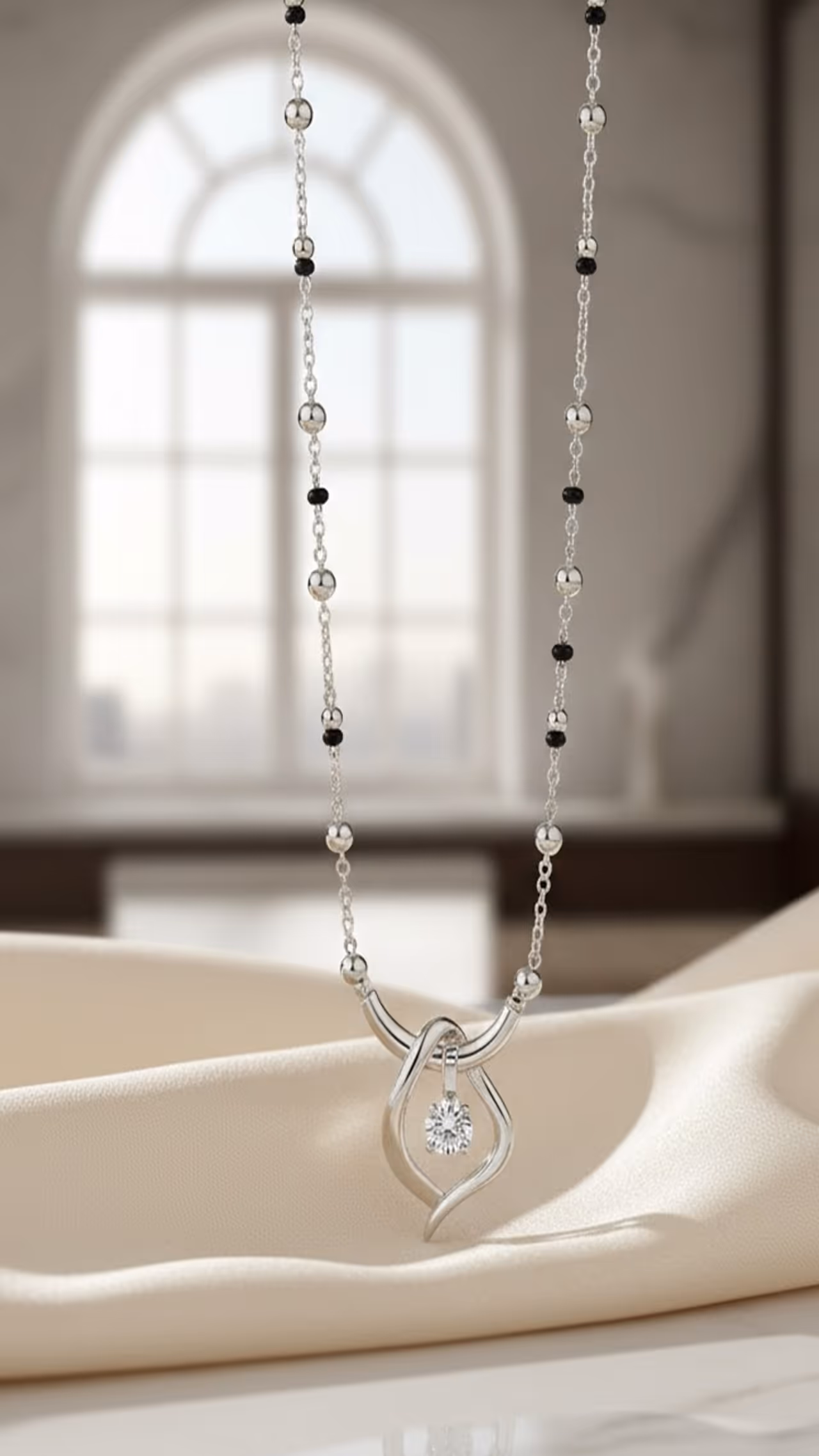 काळे मणी आणि साधा चांदीचा पेंडंट असलेले मंगळसूत्र साधे, एलिगंट आणि कमी बजेटमध्ये उपलब्ध असे डिझाईन १,५०० ते ३,००० रुपयांत तयार होऊ शकते. त्यामुळं आपण चांदीचे मंगळसूत्र गिफ्ट म्हणून देऊ शकणार आहेत.