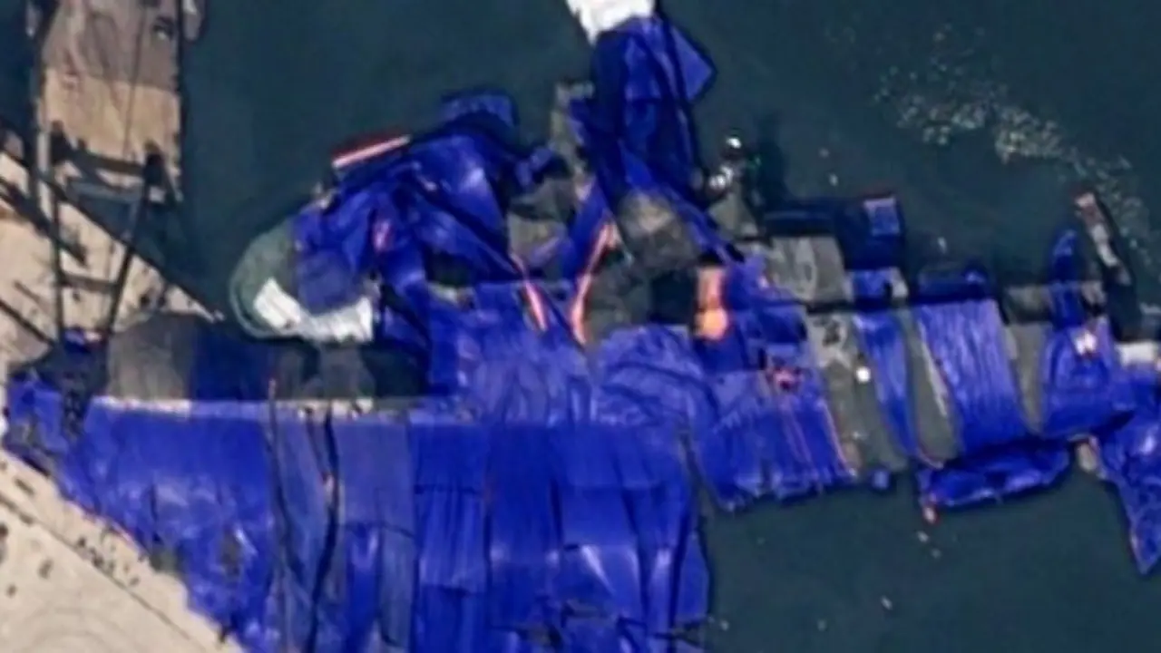 आता हे जहाज पाण्यात एका बाजूला झुकलेले आहे आणि वरून ते निळ्या आच्छादनाने झाकण्यात आले आहे जेणेकरून संपूर्ण नुकसान जगाच्या नजरेपासून लपवता येईल.