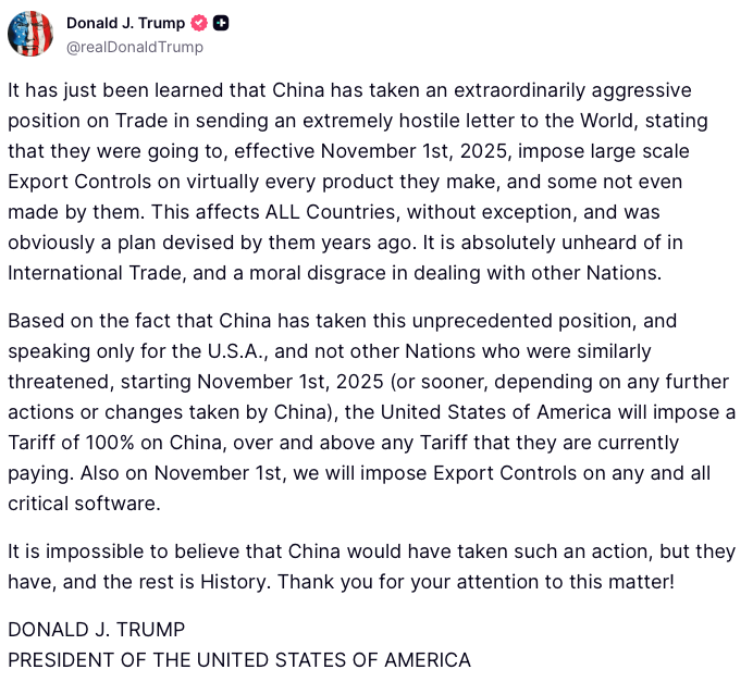 चीनने दुर्मिळ खनिजांच्या निर्यातीवर नियंत्रण ठेवल्याने निर्माण झालेल्या वादानंतर ट्रम्प यांनी हे नवीन पाऊल उचलले आहे. चीनच्या 'आक्रमक' पावलांना प्रत्युत्तर म्हणून १ नोव्हेंबरपासून अतिरिक्त शुल्क लागू होईल, अशी घोषणा ट्रम्प यांनी केली आहे. चीनने दुर्मिळ भू-खनिजांच्या निर्यातीवरील निर्बंधांबाबत जगभरातील देशांना पत्र पाठवून स्पष्टीकरण दिल्याचे ट्रम्प यांनी 'ट्रुथ सोशल'वर सांगितले. अमेरिकेतून होणाऱ्या महत्त्वाच्या सॉफ्टवेअर निर्यातीवरही १ नोव्हेंबरपासून निर्बंध लागू होतील, असे ट्रम्प म्हणाले.