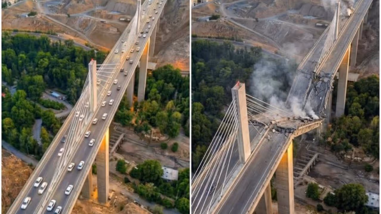 US Israel Airstrikes Demolish Irans Karaj Bridge : इराणमधला सर्वात उंच पूल, जो अजून बांधून पूर्ण व्हायचा होता, तो कोसळला आहे. हा पूल तेहरानला पश्चिमेकडील करज शहराशी जोडणार होता. तब्बल १३६ मीटर उंच असलेला हा पूल म्हणजे मध्य पूर्वेतील इंजिनिअरिंगचा एक उत्तम नमुना मानला जात होता. पण अमेरिका आणि इस्रायलने केलेल्या हवाई हल्ल्यांमध्ये या पुलाचं मोठं नुकसान झालं आहे.